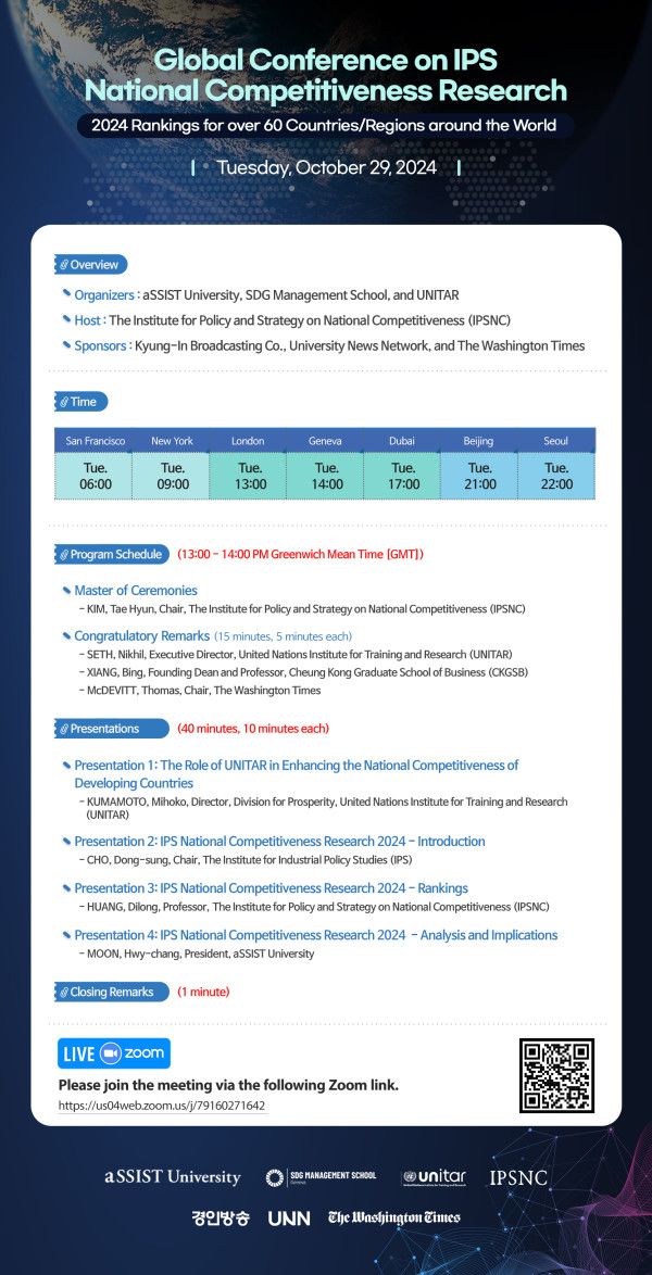 이번 콘퍼런스에서 논의된 결과와 2024년 국가경쟁력 순위를 담은 책이 11월 초 출간될 예정으로, 글로벌 정책 및 경제 연구자들에게 실질적 참고 자료가 될 전망이다. 콘퍼런스 참석을 원하는 경우, 해당 일시에 Zoom 웨비나 링크를 통해 온라인으로 접속 가능하다.