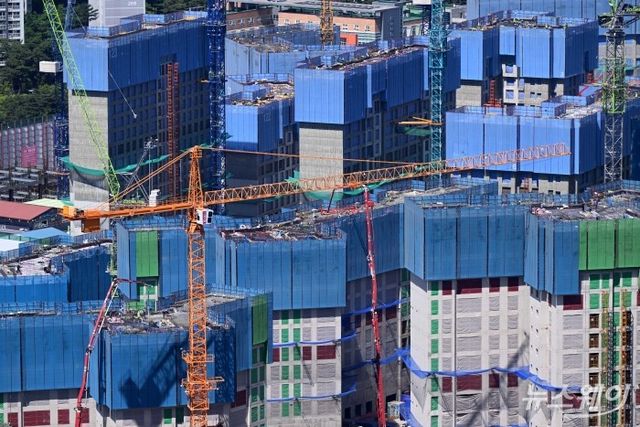 아파트 외벽에 설치된 거푸집(갱폼)에 콘크리트를 타설해 건물을 올리는 모습. 사진=강민석 기자 kms@newsway.co.kr