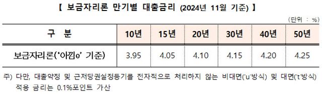 이에 ‘아낌e-보금자리론’ 기준으로 연 3.95(10년)~4.25%(50년)가 적용된다. 저소득청년, 신혼가구, 사회적배려층(장애인·한부모 가정 등) 및 전세사기피해자 등이 추가 우대금리(최대 1.0%포인트)를 적용받을 경우, 최저 연 2.95(10년)~3.25%(50년) 금리가 적용된다.