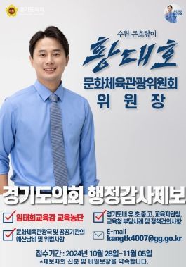 [와이뉴스] 경기도의회 문화체육관광위원회 황대호 위원장(더불어민주당, 수원3)이 2024년도 행정사무감사를 앞두고 도민들을 대상으로 공개제보를 받는다고 SNS 등을 통해 알렸다.