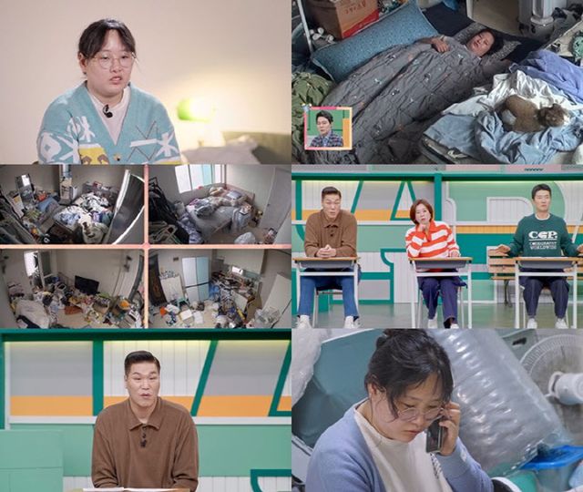 재연드라마가 끝나자, 김정민과 아들이 함께 사는 일상이 공개된다. 아침 일찍 눈을 뜬 김정민은 방 한 쪽에서 쪽잠을 자는 모습이라 의아함을 안긴다. 알고 보니 방 침대는 물론, 거실과 욕실 등이 각종 잡동사니와 음식물 쓰레기, 반려묘의 오물 등으로 가득 차 있어 발 디딜 틈이 없는 것. 스튜디오에서 이를 본 MC 박미선은 “누울 자리를 보고 발을 뻗으라는데 발 뻗을 곳이 없다. 최악이다”라며 한숨을 쉬고, 서장훈 역시 “집을 넓은 쓰레기통으로 사용하고 있는 것 같다. 너무 어이가 없어서 혼낼 의욕조차 없다”고 말한다. 이에 대해 김정민은 제작진과의 인터뷰를 통해 “주변 정리를 잘 못하는 편이고, 저장강박증이 있다. 여기에 우울증까지 있어서, 매사에 무기력해진다. (집이 쓰레기장처럼 된 지) 1년이 좀 넘었다”고 털어놓는다.