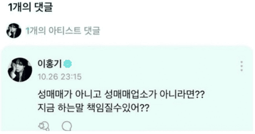 이후 이홍기는 또 다시 팬 커뮤니티에 "성매매가 아니고 성매매 업소가 아니라면? 지금 하는 말 책임질 수 있어?"라는 글을 업로드해 최민환 2차 옹호 논란이 일었다.