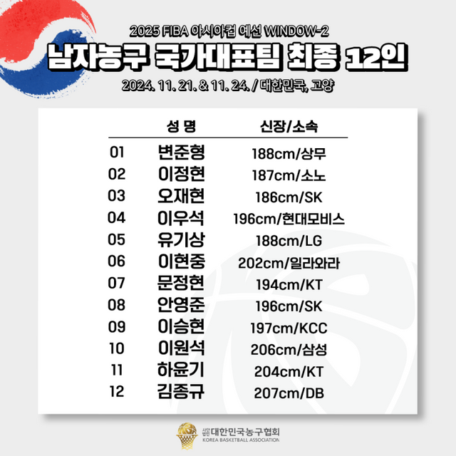 ▲ 2025 FIBA 아시아컵 예선 대비 남자농구 대표팀 12인 선수 명단