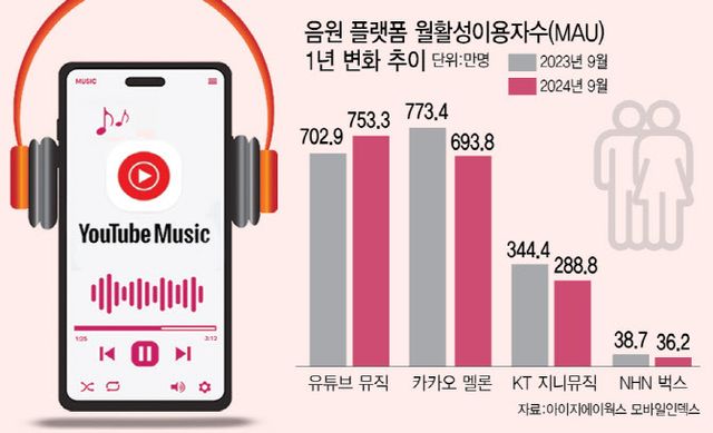 반면 카카오엔터테인먼트의 멜론은 올 9월 693만888명을 기록, 전년동기의 773만4991명 대비 10.39% 감소했다. KT(030200)의 지니뮤직도 9월 288만 8758명으로 전년동기의 344만4278명보다 16.11% 급감했다. NHN(181710)의 벅스는 9월에 36만2438명으로 전년동기 38만7509명 대비 6.46% 줄었다.