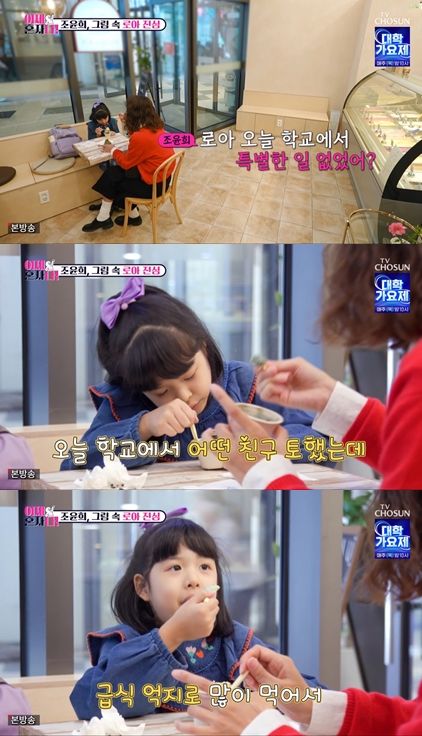 조윤희는 "학교에서 뭐 특별한 일은 없었냐"라고 물었고, 로아는 "어떤 친구가 급식을 억지로 먹다가 토했다"라고 얘기했다.
