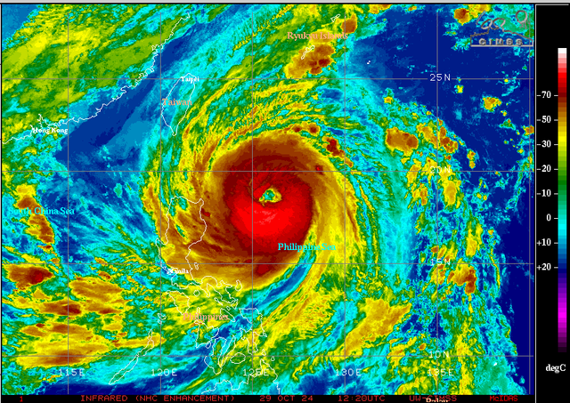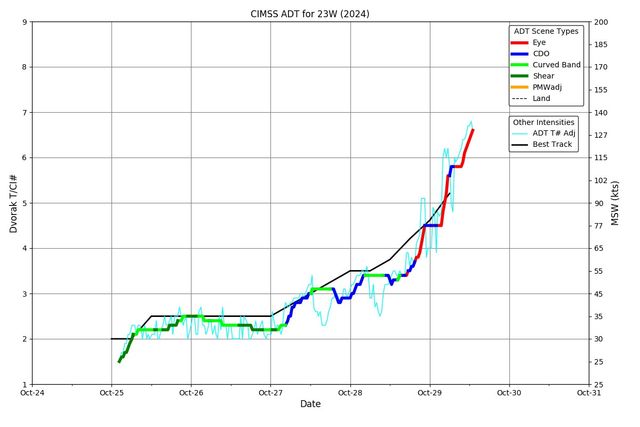 ํ ์์ 21ํธ ํํ ์ฝฉ๋ ์ด์ ์ค์ฌ๊ธฐ์์ ์ฝ 944hPa, 1๋ถ ํ๊ท ์ต๋ํ์์ ์์ ์ฝ 213km(115๋ ธํธ)์ ์ด๋ฅด๋ 4๋ฑ๊ธ์ ๋งค์ฐ ๊ฐ๋ ฅํ ํํ์ผ๋ก ๋ฐ๋ฌํ ์ํ์ด๋ฉฐ, ์ด๋ 24์๊ฐ ์ด์ ์ ์ค์ฌ๊ธฐ์ 980hPa, 1๋ถ ํ๊ท ์ต๋ํ์ 60๋ ธํธ๊ณผ ๋น๊ตํ๋ฉด ์ค์ฌ๊ธฐ์์ 36hPa๊ฐ ํ๊ฐ, 1๋ถ ํ๊ท ์ต๋ํ์์ 55๋ ธํธ๊ฐ ์ฆ๊ฐํ๋ฉด์ ๋งค์ฐ ๋น ๋ฅธ ๋ฐ๋ฌ์๋๋ก ํํ์ ๊ธ๊ฐํ ํน์ ๊ธ์๊ฐํ(RI) ํ์์ด ๋ฐ์ํ์์์ ์ ์ ์์(Dvorak T๊ฐ 6.5๋ํ)