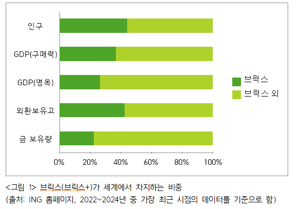 브릭스 국가들의 인구는 세계 인구의 44%를 차지한다. 세계 GDP(구매력 기준)에서 차지하는 비중은 2023년 기준으로 36.8%. 세계 외환보유고에서 차지하는 비중은 2023년 기준으로 42.4%. 앞으로 브릭스의 영향력은 더 커질 것으로 예상된다.