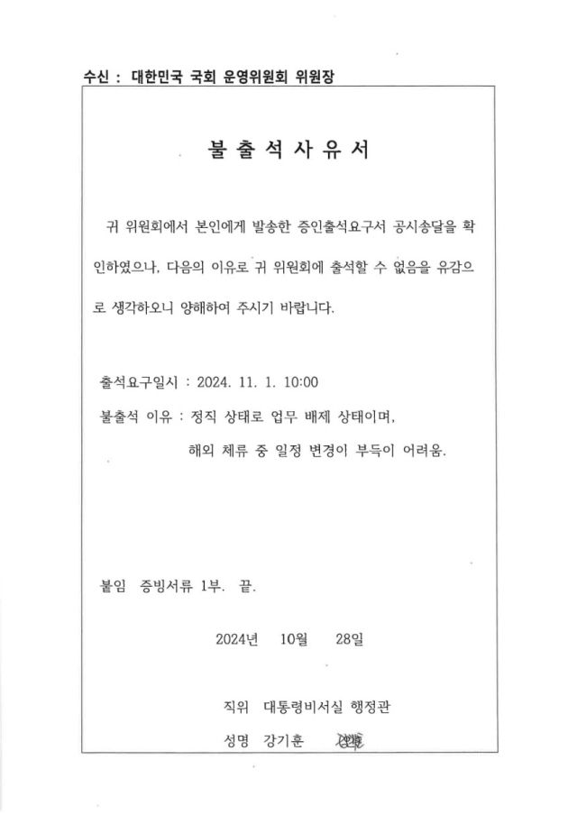 천하람 개혁신당 원내대표는 29일 자신의 페이스북을 통해 강 선임행정관의 국회 불출석 사유서를 공개했다.