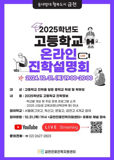 [파이낸셜경제=김영란 기자] 금천구는 10월 31일 오후 7시에 ‘금천진로진학지원센터’ 유튜브 채널에서 2025학년도 고등학교 진학설명회를 진행한다고 밝혔다.