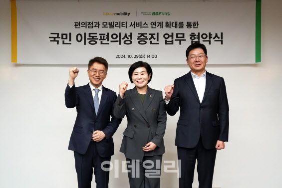 카카오모빌리티는 지난 29일 서울 영등포구 여의도에서 BGF리테일(282330)과 ‘편의점-모빌리티 서비스 간 연계 확대를 통한 국민 이동편의성 증진’ 업무협약(MOU)을 체결했다. 이날 협약식에는 류긍선 카카오모빌리티 대표이사와 민승배 BGF리테일 대표이사, 국회 국토교통위원회 소속 김희정 국민의힘 의원 등이 참석했다.