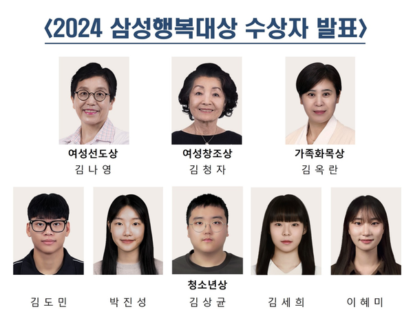 삼성생명공익재단이 '2024 삼성행복대상 수상자'를 선정했다고 30일 밝혔다. 올해 수상자는 ▲여성선도상 김나영(63, 서울대학교 의과대학 교수), ▲여성창조상 김청자(80, 성악가), ▲가족화목상 김옥란(52, 푸른고래리커버리센터 센터장), ▲청소년상 김도민(18, 반여고 2), ▲박진성(17, 인천진산과학고 2), ▲김상균(17, 울산상업고 2), ▲김세희(20, 백석예술대 2), ▲이혜미(21, 총신대 3) 등 총 8명이다. 각 부문별 수상자에게는 상패와 상금 각 5000만원(청소년상 각 500만원)이 수여되며, 시상식은 12월 2일 월요일 오후 3시 서울 용산구 한남동 리움미술관에서 개최될 예정이다.