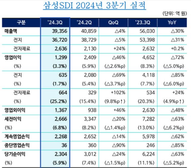삼성SDI는 편광필름 사업 양도 결정에 따라 이번 3분기 실적부터 해당 손익을 별도 분리해 실적이 소폭 감소했다고 설명했다. 다만 편광필름 사업을 포함할 경우에도 3분기 영업이익은 1413억원에 불과해, 전분기인 지난 2분기 영업이익 2409억원 대비 크게 부진하다.