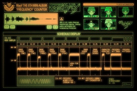 그런가 하면, 오늘(30일) WayV 공식 SNS 채널에서 오픈된 스케줄 포스터는 이번 앨범명 ‘FREQUENCY(주파수)’에 맞춰 오실로스코프(여러 전압 신호를 지속적으로 관측 가능한 전자식 측정 기기)를 테마로 해 눈길을 끌었다.