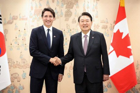 윤 대통령은 다음 달 1일 열리는 한-캐나다 외교·국방 2+2 장관회의를 언급하며 “양국 간 고위급 안보 대화가 제도화되길 바란다”고 했다. 특히 “양국이 포괄적 안보 협력을 증진시켜 나가는 데 있어 방산 협력이 중요한 의미를 갖는다”며 “캐나다의 국방력 증강 사업에 우리 기업이 참여해 호혜적 방산 협력을 강화해 나가길 희망한다”고 말했다. 트뤼도 총리도 “한국 방위 산업의 우수성을 잘 알고 있다”며 “가치를 공유하는 전략적 협력국인 한국과의 협력을 기대한다”고 화답했다. 캐나다 정부는 600억 캐나다달러(약 60조 원) 규모 잠수함 도입 사업을 추진하고 있는데 한국 조선기업들도 수주를 노리고 있다.