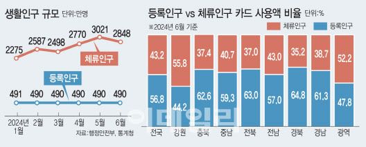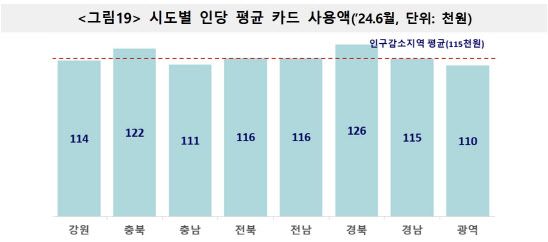 6월 기준 체류인구의 평균 카드 사용액은 1인당 약 11만5000원이었다. 지역 총 카드 사용액 중 등록인구가 쓴 비중은 56.8%였으며, 체류인구가 쓴 비중은 43.2%로, 이는 등록인구 카드 사용액의 76%에 육박한다. 게다가 강원에서 체류인구의 신용카드 사용 비중(55.8%)이 등록인구 사용 비중보다 더 크게 나타났다. 양양군의 경우 체류인구 소비 비중이 71.6%로 높았다.