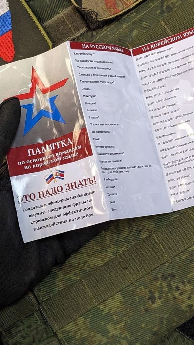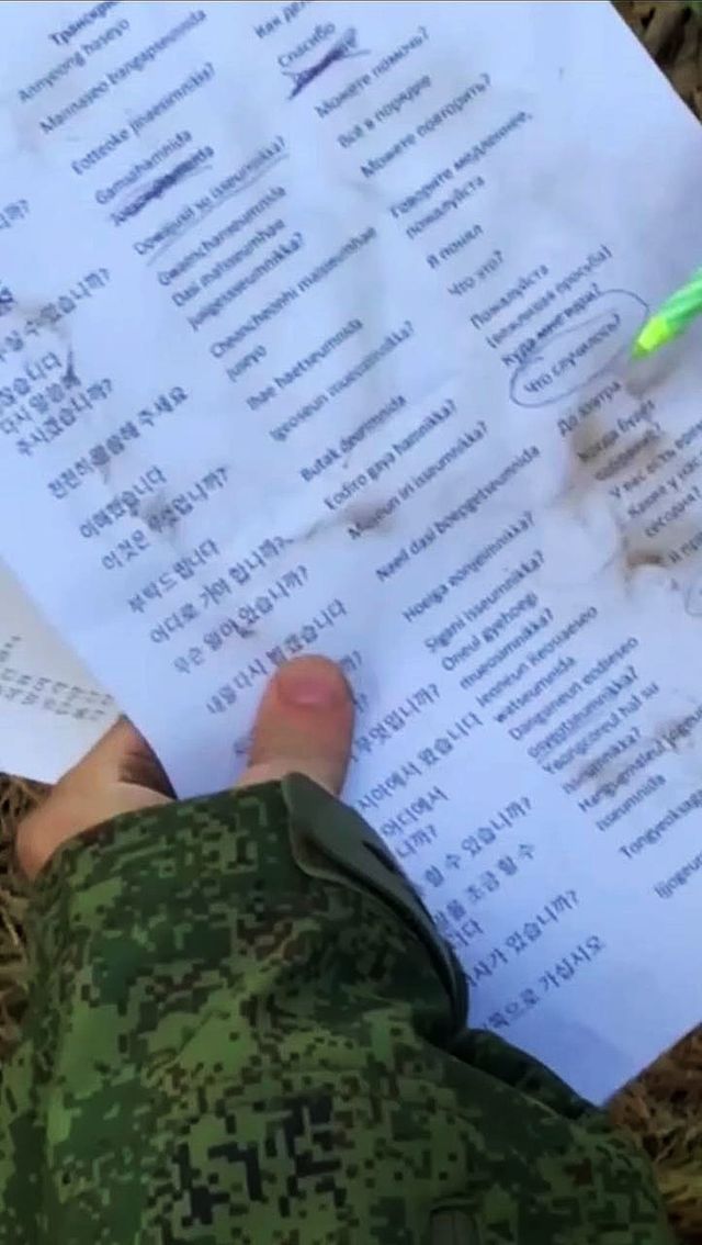 한 'X'(옛 트위터) 계정에는 한국어와 러시아어로 작성된 군사용어 책자 사진이 올라오기도 했다. 책자 표지에는 러시아 국기와 인공기가 그려져 있다. 국기 아래에는 '병사와 장교들은 전장에서 효율적인 의사소통을 위해 다음 한국어 문구를 익혀야 한다'고 러시아어로 적혀 있다.