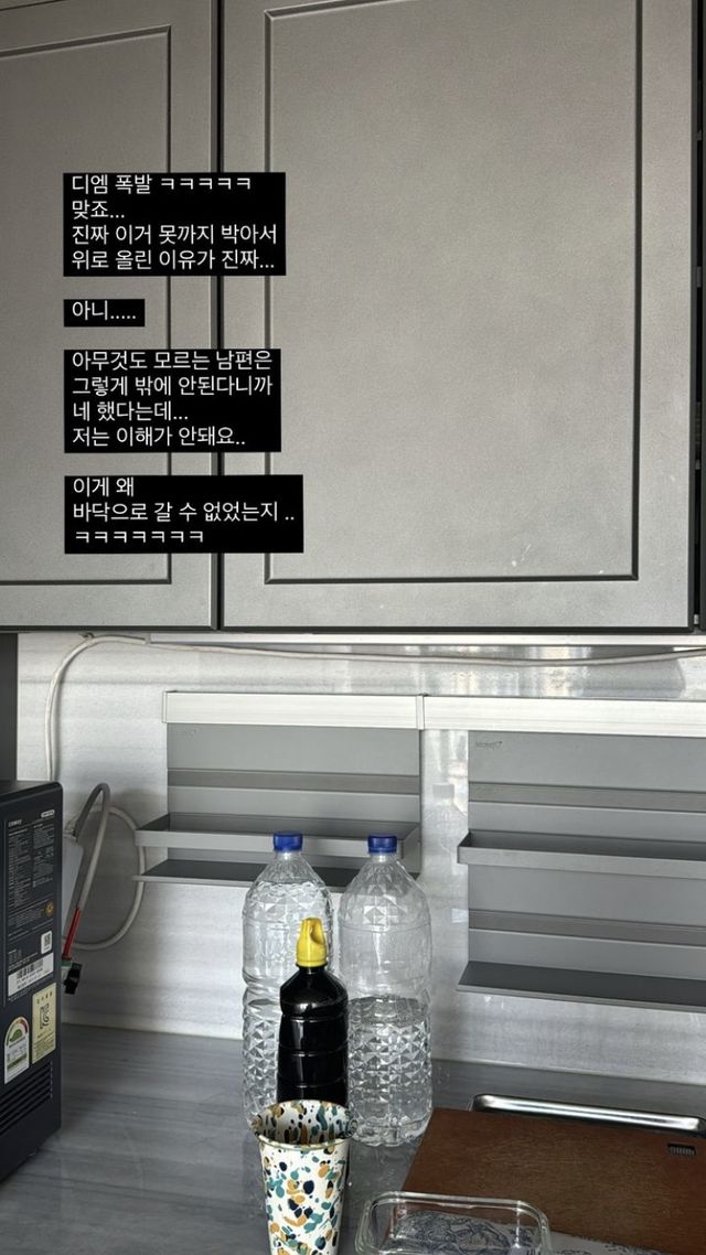 이솔이는 “아니 진짜 나만 이상해? 아래로 붙이자나 보통. 위로 대롱대롱 매달려있고.. 특별한 이유가 있나? 진짜 궁금하다”라며 부엌 전체샷까지 공개했다. 이후 누리꾼들 반응이 쏟아졌는지 “디엠 폭발”이라며 “아무것도 모르는 남편은 그렇게밖에 안 된다니까 ‘네’ 했다고 하는데 저는 이해가 안 된다”고 하소연했다.