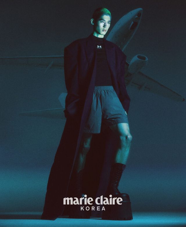 네이비 심리스 코트, 타이트한 모크넥 티셔츠, 트랙 쇼츠, 청키한 부츠 모두