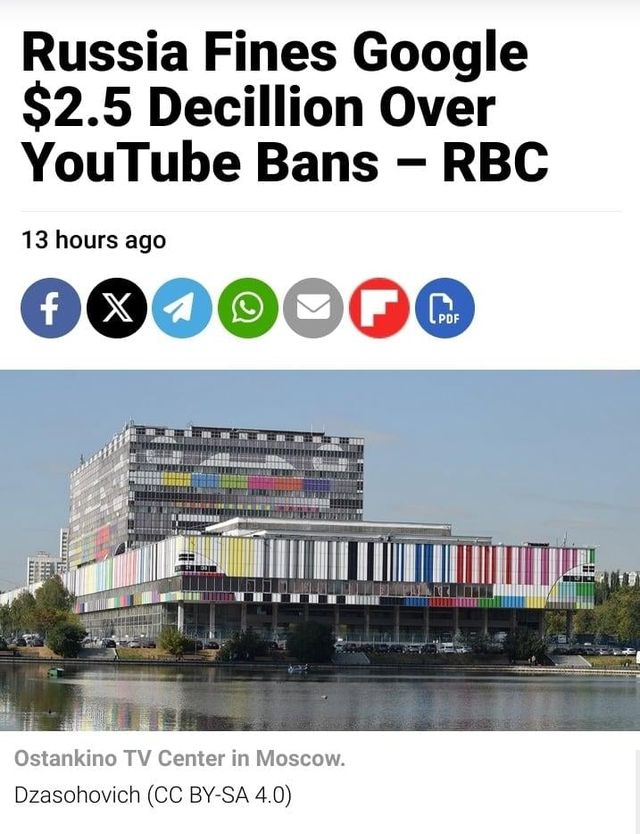 러시아 법원이 구글에 러시아 매체들의 콘텐츠 차단과 관련하여 $25,000,000,000,000,000,000,000,000,000,000,000 (2.5 x 10³³ 달러) 규모의 벌금을 부과했습니다. 이는 전 세계 GDP가 약 100조 달러로 추산되는 것과 비교해 엄청난 금액으로, 지구상에 존재하는 모든 돈을 모아도 부족한 금액입니다.