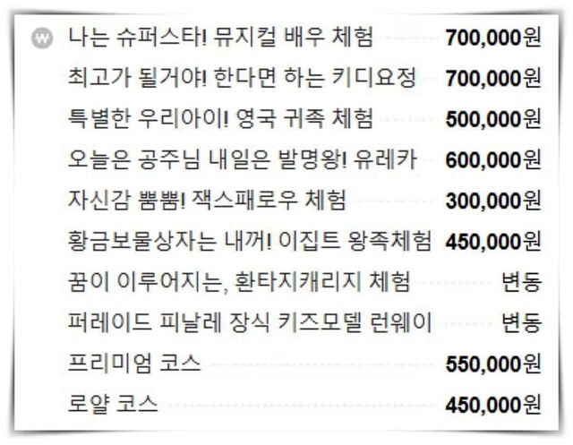 롯데월드 샤론캣 드레스샵 이용요금표. 롯데월드는 외부 업체가 운영 중인 샤롯캣 드레스샵을 통해 4~8세 아이들이 공주와 왕자로 변신해 퍼레이드에 참여하는 프로그램을 유료로 제공하고 있다. / 네이버