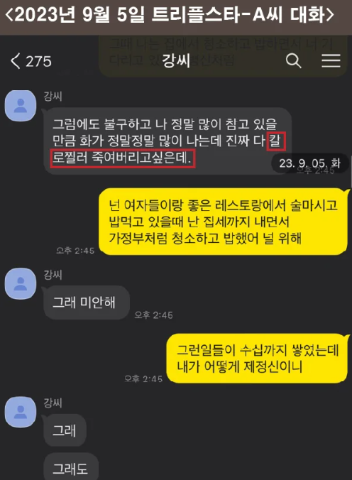 게다가 A 씨는 트리플스타와 이혼 이후 지난 2023년 8월 새로운 남자친구와 교제할 당시 트리플스타가 "칼로 찔러 죽이고 싶다"라고 협박했다고 주장했다.