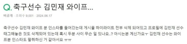 당시 한 누리꾼이 온라인 커뮤니티에 “축구선수 김민재 와이프 분 인스타를 들어갔는데 게시물, 하이라이트 전부 삭제됐고 프로필에 김민재를 태그 한 것도 사라졌다"며 두 사람 관계에 무슨 일이 생긴 것이 아닌지 의문을 제기한 바 있다.