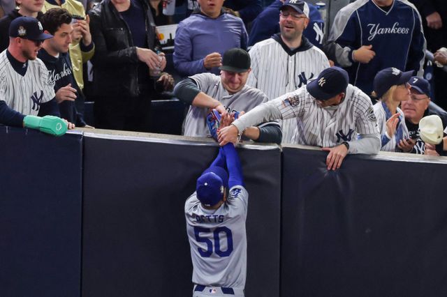 그런데 문제는 포구 이후 벌어졌다. 관중석에서 이를 지켜보던 맨 앞줄 관중이 이미 포구를 마친 베츠의 글러브를 잡았고, 베츠가 포구에 실패하도록 글러브를 잡고 뺏으려 한 것이다. 베츠가 공을 놓치지 않게 매달리면서 오른쪽 손으로 이를 떨쳐내려 하자 옆에 있던 또 다른 관중은 아예 그의 오른 손목마저 잡으며 베츠가 펜스에 매달리는 모양새를 만들었다. 결국 공은 떨어졌지만, 이 '참상'을 모두 보고 있던 심판은 '당연히' 아웃을 선언했다.
