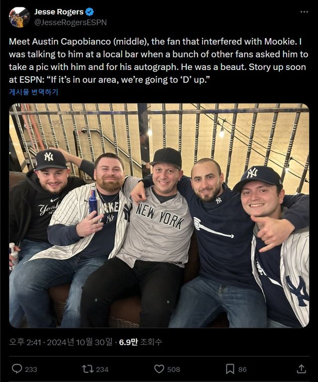 월드시리즈(WS) 무대에서 희대의 수비 방해를 일으킨 뉴욕 양키스 팬이 경기장 퇴장 후에도 당당한 모습으로 인터뷰에 응했다.