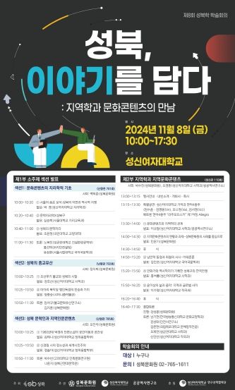 이번 학술회의는 성신여자대학교 연구산학협력단이 후원하며, ‘성북, 이야기를 담다: 지역학과 문화콘텐츠의 만남’을 주제로 오전 10시부터 오후 5시 30분까지 진행한다.