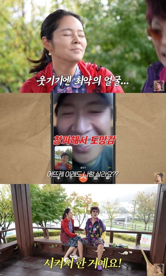 한가인의 얼굴에 파란색 눈썹을 그리며 “난 시켜서 한 거다. 남편이 보면 어쩌나 싶다”라며 해명했다. 잠시 후 가발 세팅까지 완벽하게 마친 한가인은 남편 연정훈과 영상 통화에 나섰다. 화면 속 한가인의 충격적인 모습에 연정훈은 그대로 웃음을 터뜨렸다.