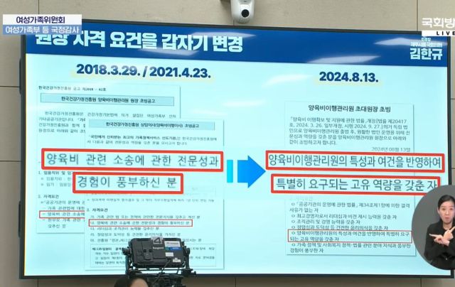 더불어민주당 김한규 의원은 30일 오후 국회에서 열린 여가위 국감에서 "양육비이행관리원장 모집 공고가 '양육비 관련 소송에 관한 전문성과 경험이 풍부하신 분'에서 '양육비이행관리원의 특성과 여건을 반영하여 특별히 요구되는 고유 역량을 갖춘 자'로 바뀌었다"며 "양육비 소송에 대한 전문성 없는 사람을 낙하산으로 임명하려는 꼼수 아니냐"고 지적했다.