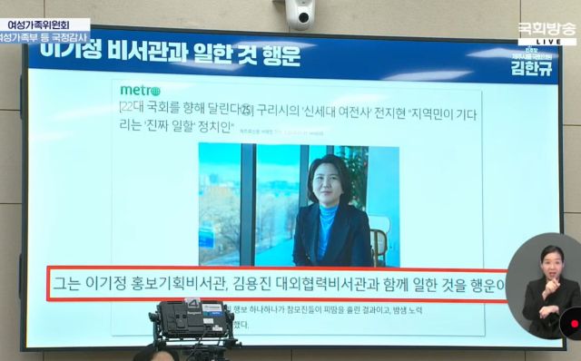 김 의원은 "누가 왜 전지현 전 행정관을 낙하산으로 보내려 하나 행적들을 찾아봤더니 이유가 있었다. 김건희 여사를 적극 옹호하는 역할들을 했다"며 "본인 SNS에서 옹호하는 것도 그렇고 한동훈 대표에 대한 공격도 서슴지 않는다. 방송 패널로 나가 김 여사를 보호한 사례도 매우 많다"고 했다. 그러면서 신영숙 여가부 장관 직무대행을 향해 "누구한테서 전 전 행정관을 임명하라는 지침을 받았느냐"고 물었다.