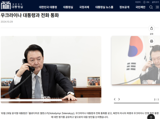 통화에서 윤 대통령은 “북한이 러시아에 대한 군사무기 지원을 넘어, 특수부대 파병이라는 위험하고 전례 없는 일을 벌이고 있다”면서, “러북 군사밀착의 직접적인 이해 관계자인 한국과 우크라이나가 앞으로 긴밀히 소통하며 대응을 조율해 나가자”고 말했다.