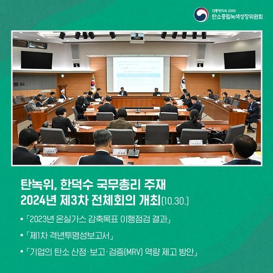 대통령 직속 ‘2050 탄소중립녹색성장위원회’(탄녹위)는 30일 정부 서울청사에서 한덕수 국무총리 주재로 제3차 전체회의를 열어 ‘2023년 온실가스 감축목표 이행점검 결과’와 ‘제1차 격년투명성 보고서’, ‘기업의 탄소 산정·보고·검증(MRV) 역량 제고 방안’을 심의·의결했다고 밝혔다.
