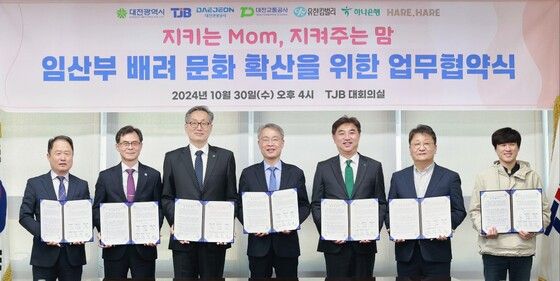 대전시는30일㈜대전방송(TJB),대전교통공사,유한킴벌리,하나은행충청영업그룹,하레하레와공동으로‘임산부배려문화확산협력체계구축을위한업무협약’을체결했다.
