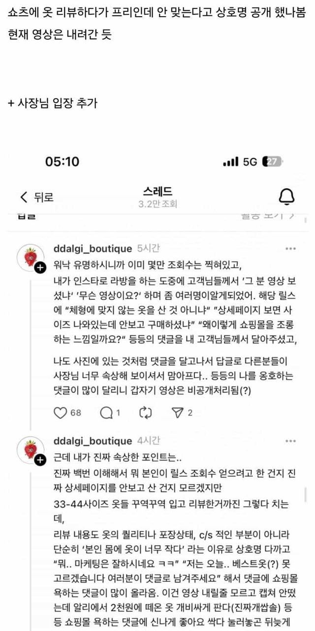 인스타 16만 인플루언서 쇼핑몰 조롱 논란 54ㄷㄷㄷ