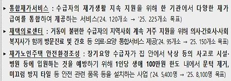 어르신이 집에 머물면서도 다양한 서비스를 받을 수 있도록 통합재가서비스, 재택의료센터, 재가노인주택 안전환경조성 등 시범사업 등도 확대한다는 계획이다.