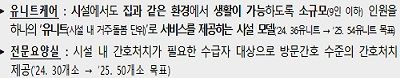 시설에 입소한 어르신들이 기존 다인실 위주에서 1인실 위주의 집과 같은 편안한 환경에서 생활할 수 있도록‘한국형 유니트케어’사업을 확대하고, 요양시설에서 간호서비스를 제공하는 전문요양실 시범사업도 확대해 추진한다.