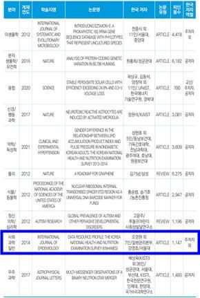 한국의 분야별 최고 피인용수 논문 목록(2012-2022)