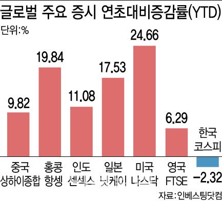 엠피닥터에 따르면 30일 기준 상해종합지수는 3266.24로 마감하며 상승 흐름을 이어가고 있다. 이날 기준 상해종합지수의 YTD는 9.82%이며 홍콩항셍지수는 19.84%다. 미국 나스닥 지수가 기록한 24.66%(29일 기준)에 근접한 수치다. 반짝 반등에 불과할 것이란 비관론이 여전하나 장기간의 하락세 끝에 저점을 찍은 게 아니냐는 인식이 커지는 배경이다. 코스피 지수의 YTD는 -2.32%로 부진하다.