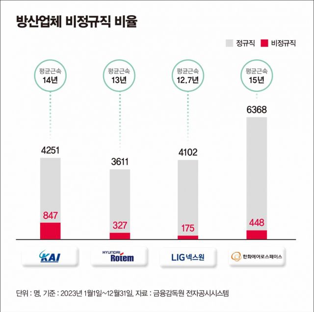 31일 금융감독원 전자공시시스템에 따르면 지난해 KAI의 정규직 대비 비정규직 비율은 19.9%(정규직 4251명·비정규직 847명)에 달한다. LIG넥스원이 4.26%(정규직 4102명·비정규직 175명)으로 가장 낮았다. 한화에어로스페이스가 7.03% (정규직 6368명·비정규직 448명), 현대로템이 9.05%(정규직 3611명·비정규직 327명)다.