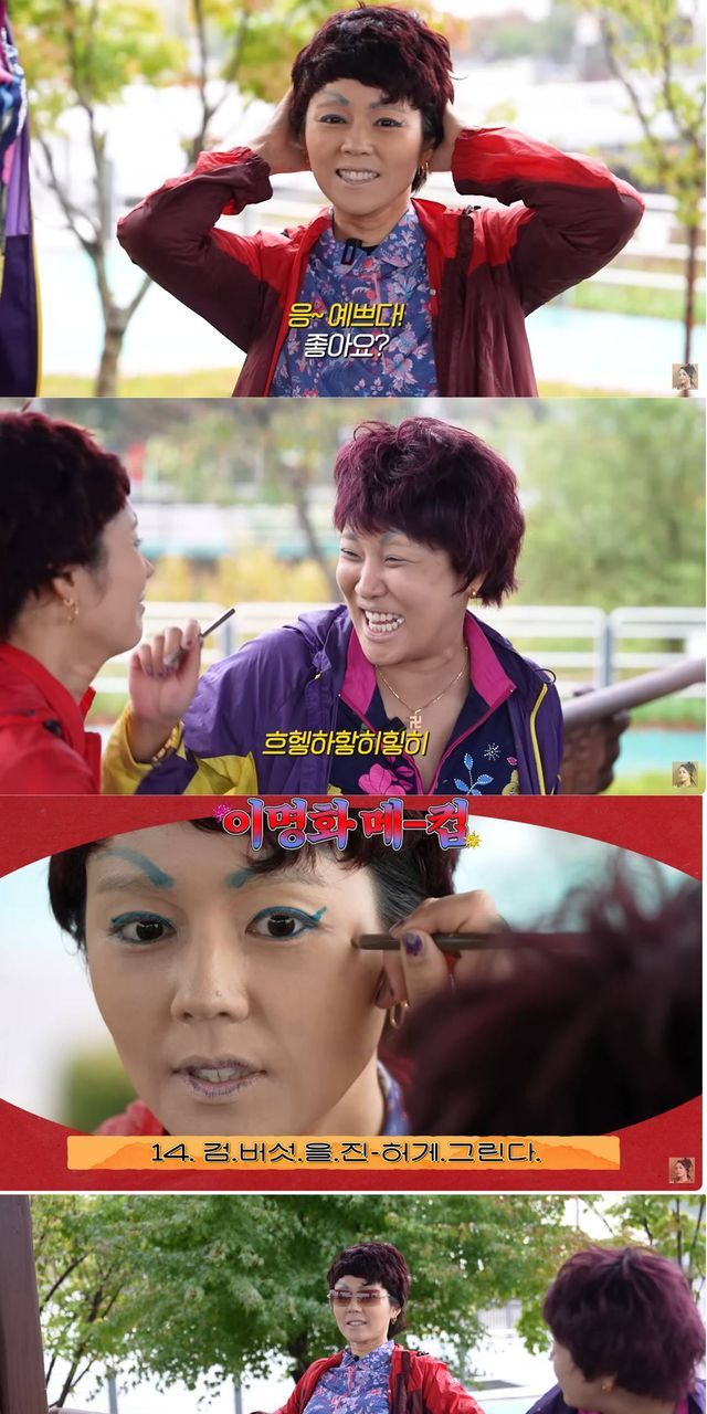 공개된 영상에서는 한가인이 유튜버 랄랄 부캐(부캐릭터) 이명화 메이크업을 하는 모습이 담겼다. 랄랄은 한가인이 분장을 해도 좋은 피부가 드러나자 검버섯과 팔자주름을 강조하는 메이크업을 해 눈길을 끌었다. 이후 가발까지 쓰자 제법 이명화 메이크업에 가까워졌다. 그러나 그럼에도 크고 뚜렷한 눈매에 랄랄은 선글라스를 추천했다.