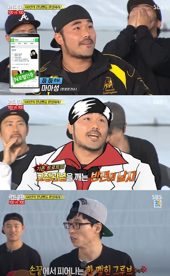 마아성은 "'런닝맨' 촬영 이틀 전에 하하 형이랑 우연히 술자리에서 만나게 됐다. 트로트 가수라고 하니까 형이 너무 깜짝 놀라면서 재밌어 했다. 그리고 얼마 뒤 영탁 형이랑 축구를 하고 있는데 갑자기 '런닝맨' 섭외 전화를 받았다. 너무 깜짝 놀랐다"고 떠올렸다.