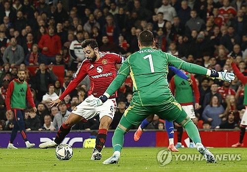 하지만 맨유는 3분 만에 다시 달아났다. 상대 박스 앞에서 프리킥을 얻은 맨유는 브루누 페르난데스의 오른발 킥이 수비벽에 굴절되면서 골키퍼 반대 방향으로 향해 골망을 흔들었다. 행운의 득점이지만, 브루누는 득점 이후 동료들과 환하게 웃어 보였다.