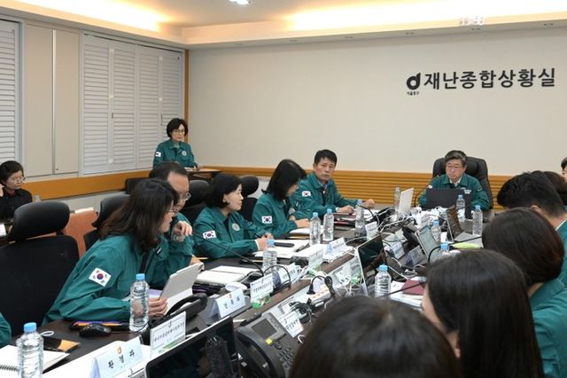 | ▲ 김길성 중구청장이 2024 재난안전훈련에서 중구 재난안전대책본부를 가동하고 상황판단 회의를 주재하고 있다. |