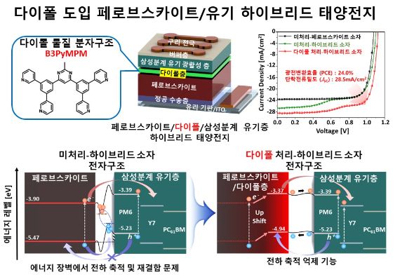 해당 구조에서 주로 발생하는 전자구조 문제를 밝히고 다이폴 층(소자 내 에너지 준위를 조절해 전하 수송을 원활하게 하고, 계면의 전위차를 형성해 소자 성능을 향상하는 역할을 하는 얇은 물질 층)을 도입해 이를 획기적으로 해결한 고성능 태양전지 소자를 발표했다.