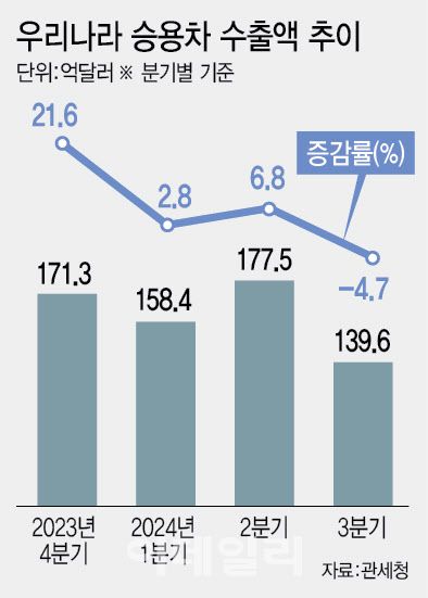 관세청은 올 3분기(7~9월) 승용차 수출액이 140억달러(약 19조3000억원)로 전년대비 4.7% 줄었다고 31일 밝혔다. 2022년 2분기 수출액이 전년대비 증가한 이후 10개 분기만의 전년대비 감소 전환이다. 수출 대수는 59만대로 전년대비 3.0% 줄었고, 대당 수출단가도 2만3562달러(약 3252만원)로 1.7% 내리며 수출액 감소 폭을 키웠다.
