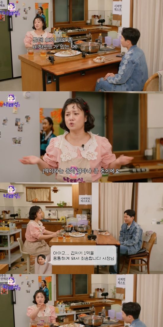 이를 들은 박나래는 "여기 약간 좀 비하인드가 있다"면서 "처음에 그 돈을 빌릴 때 1억이라는 돈이 얼마나 큰 돈이냐. 그러니까 저한테 계속 '갑자기 1억을 융통하게 돼서 죄송합니다 사장님' 이러더라"고 말했다.