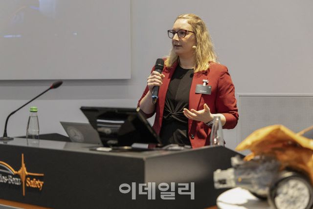 | 율리아 힌너스(Julia Hinners) 메르세데스-벤츠 충돌 안전 엔지니어가 지난 22일(현지시간) 독일 바덴뷔르템베르크주 진델핑겐에 있는 차량안전기술센터 (TFS)센터에서 벤츠 차량 안전 역사와 충돌 테스트에 대해 설명하고 있다.(사진=벤츠코리아) |