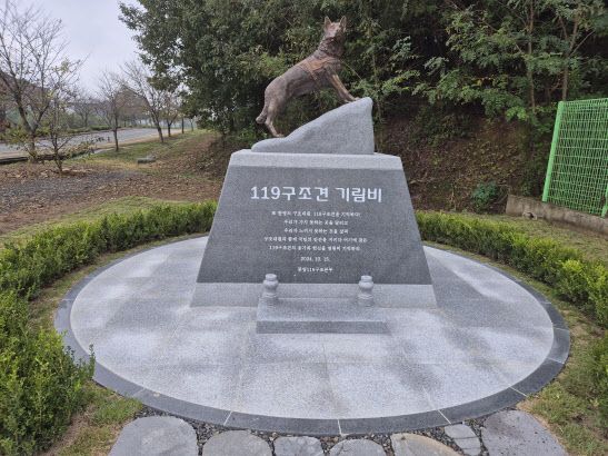 119구조견 기림비는 구조견 조각상과 중간 받침석, 하단 디딤석 등 3개 부분으로 구성됐다.